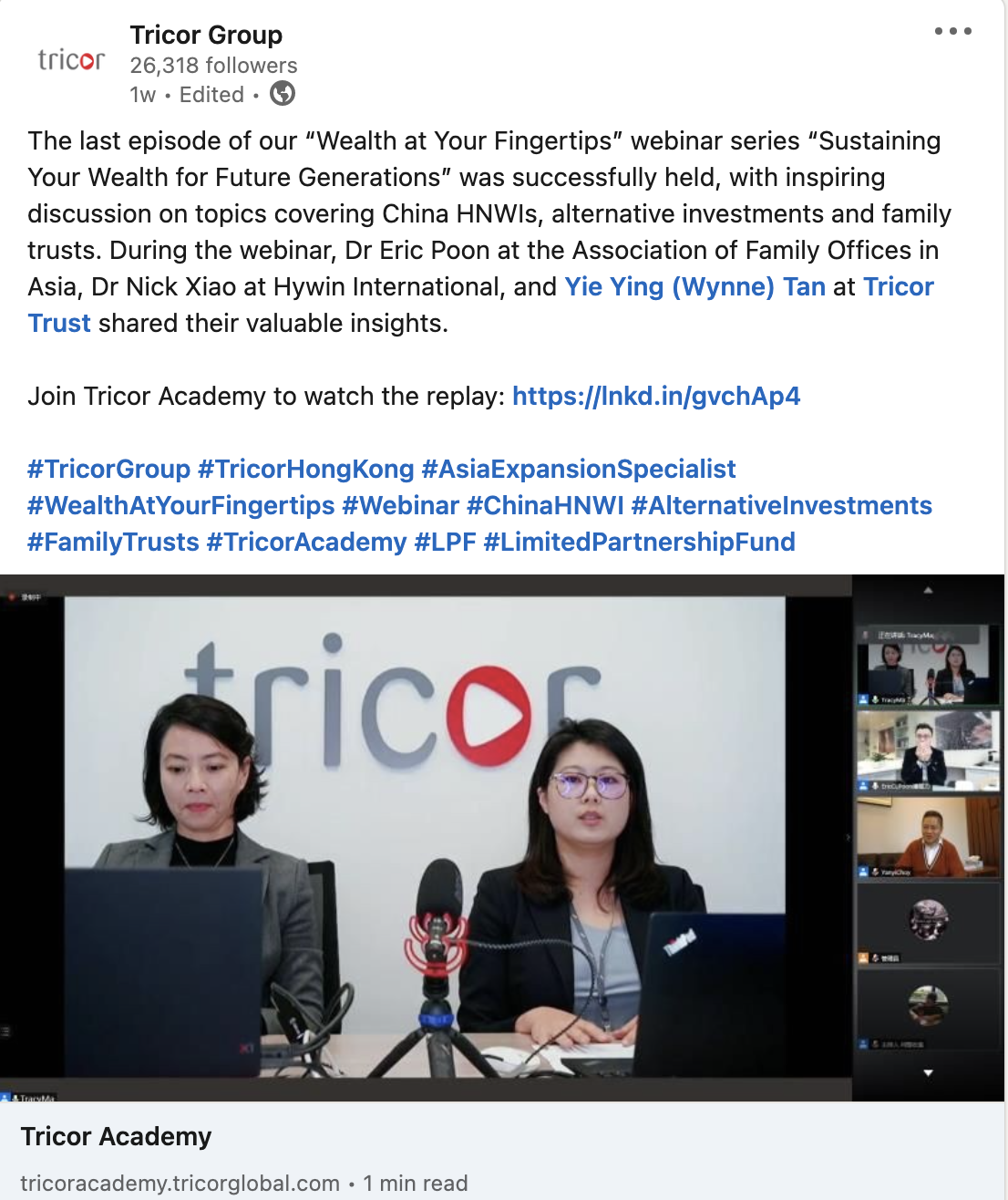 Yie Ying (Wynne) Tan shares valuable insights during the Tricor Group's webinar series, "Sustaining Your Wealth for Future Generations"
