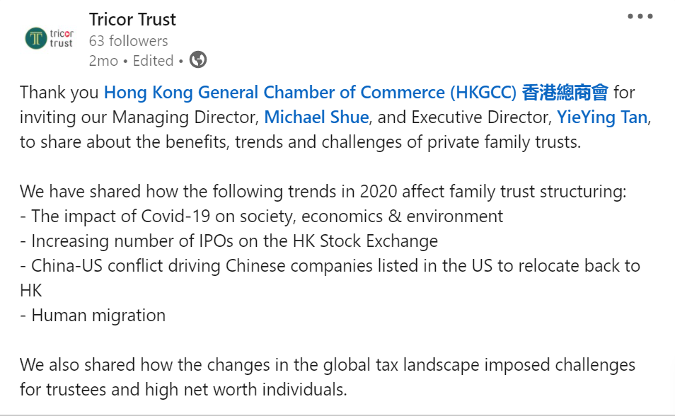 The Hong Kong Chamber of Commerce (HKGCCC) 香港總商會 invites Yie Ying Tan to share about the benefits, trends and challenges of private family trusts