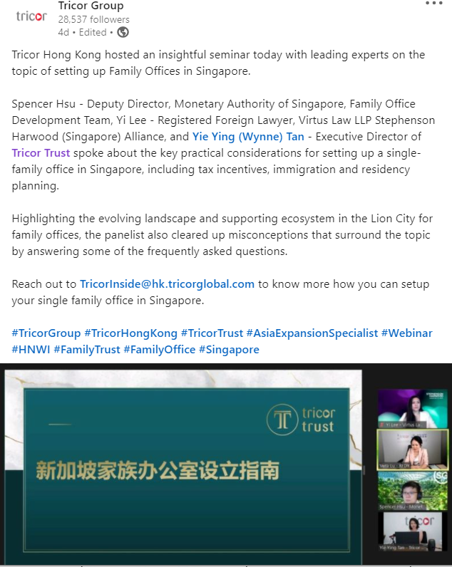 Yie Ying Tan, Executive Director of Tricor Trust, spoke about the key practical considerations for setting up single-family offices in Singapore in this insightful seminar from Tricor Hong Kong